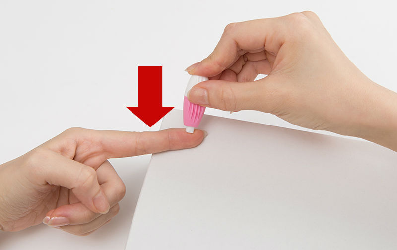 採血する側の指を台の上に置くなどして固定し、ランセットを採血部位に押し当て針を刺します。
