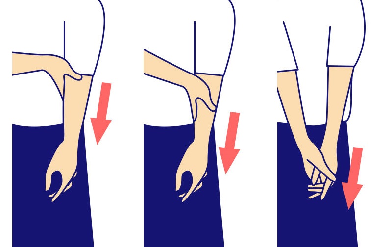 針を刺した後、肘から指先に向かってしぼりだすように圧迫します。