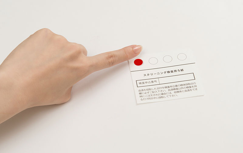 スポット内(◯の中)にポタリと血液を落とす感じで、裏面まで十分に染み込ませます。血液が落ちない場合は、血液をろ紙に軽く押し当ててください。