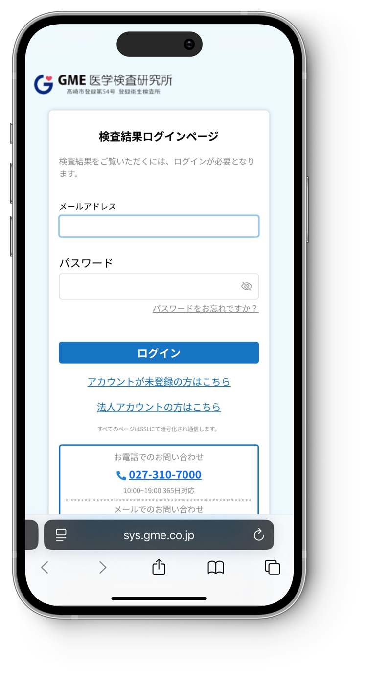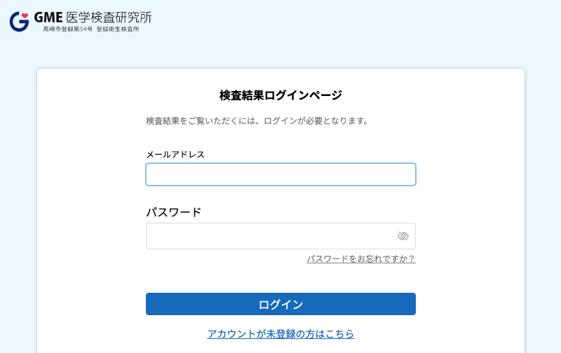 GME公式サイトの右上の「検査結果 ログイン」ボタンからログインできます。